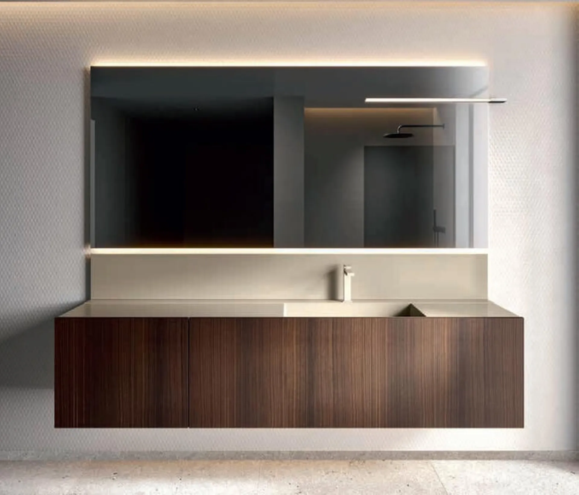 Mobili bagno sospesi in legno della marca Edoné: clicca e scopri l'arredo bagno moderno Hexis 2337 per la stanza del benessere.