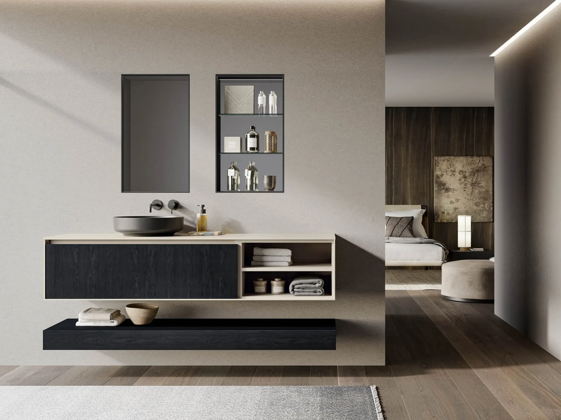 Ottieni informazioni sull'arredo bagno design: mobili bagno sospesi in legno come il modello Traccia 03 di Birex ti attendono.